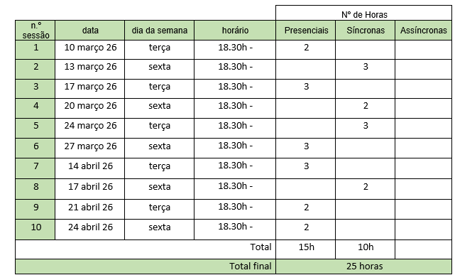 25 horas (15 presenciais e 10 online síncronas).